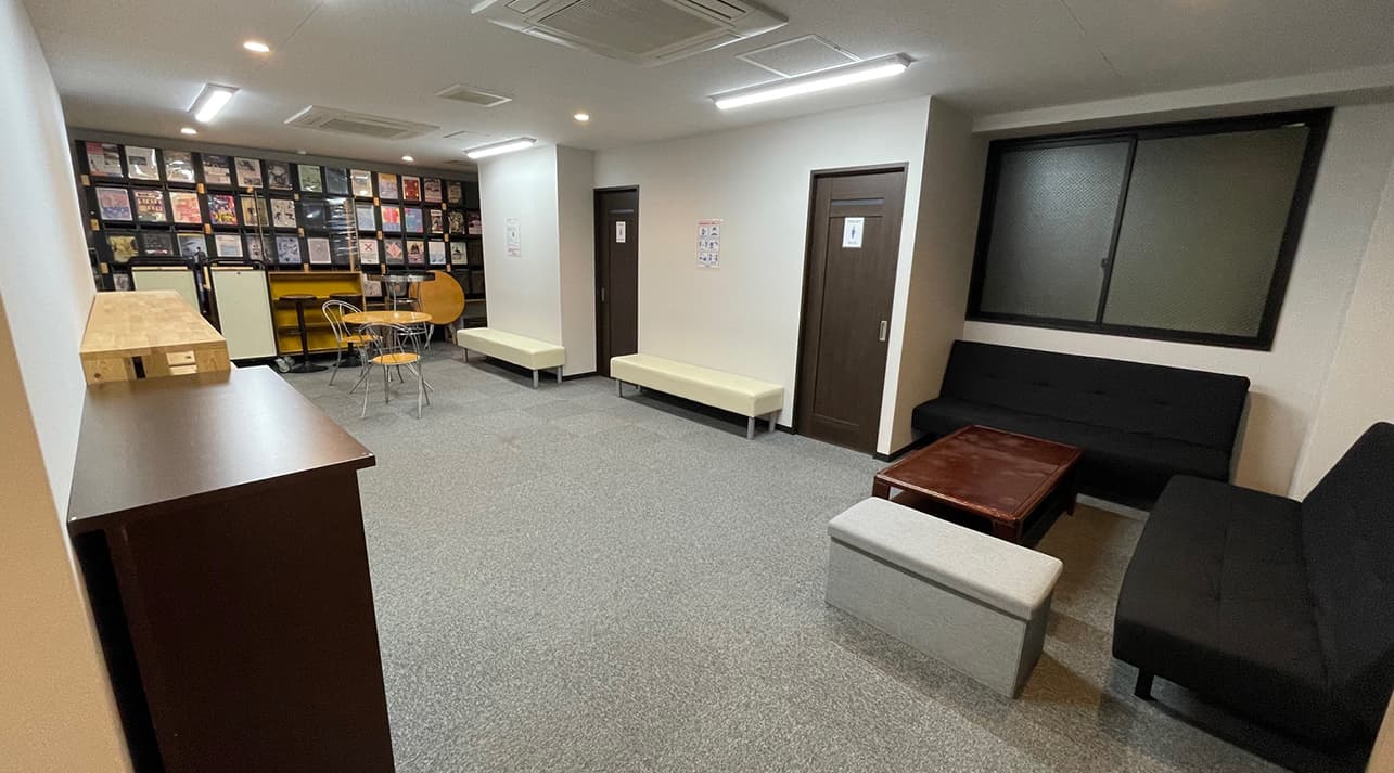 劇場2Fには100席以下の劇場としては広いロビーがあります。受付を2Fロビーで実施したり(通常は1Fエントランスで受付します。)、物販のスペースを設置したり、上演前後に観客やキャスト・スタッフがくつろぐスペースとしてお使い頂けます。ロビー奥には初代1st時代から続くオリジナルの日本一チラシを見やすいチラシラックがあり、お手洗いと自販機も設置されています。