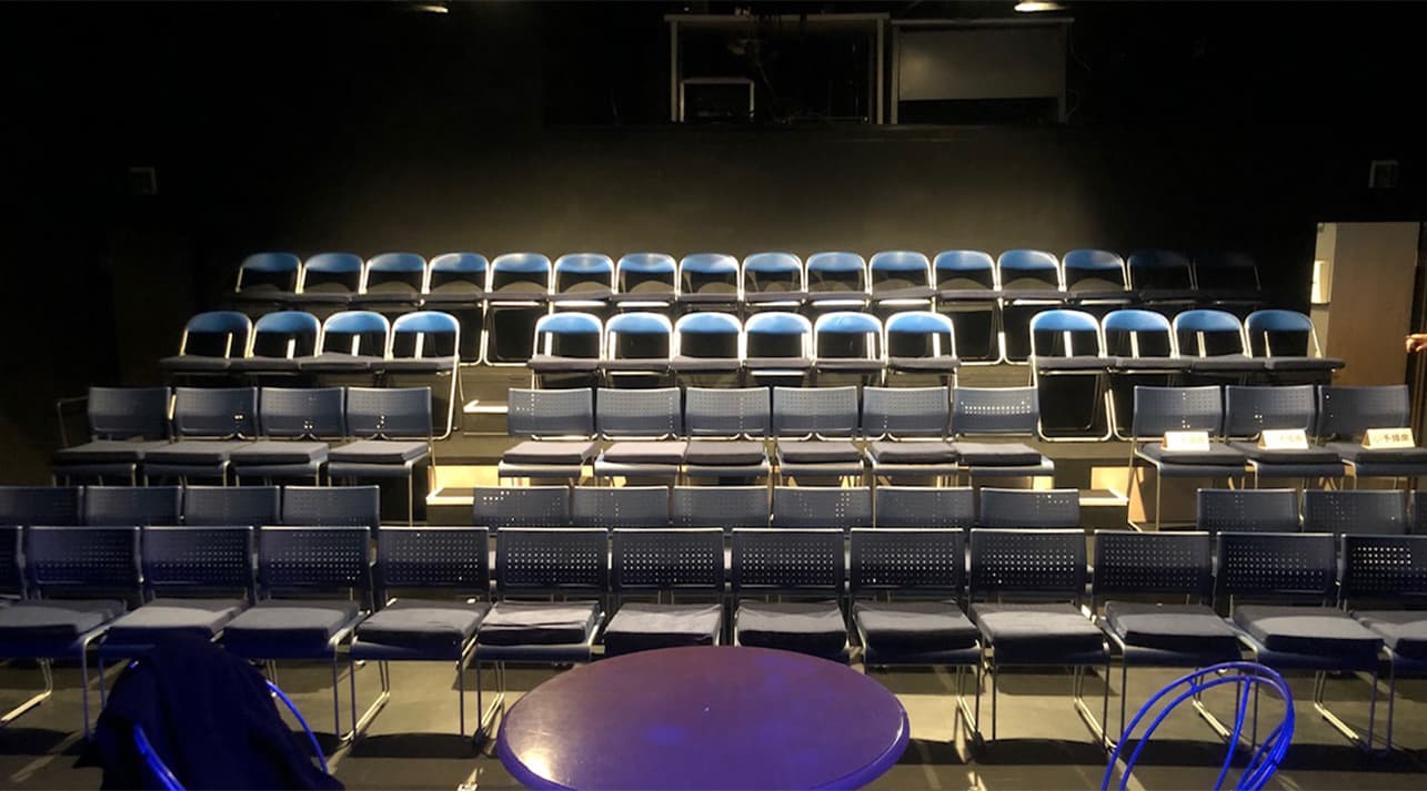 標準的な客席数は60席。落差の大きなひな壇で前の座席が気にならず、どの席からも近く見やすい構造です。スタッキングチェアとパイプイスで設置や撤去が簡単に行えるため、仕込み・バラシ時は座席を撤去して作業用のスペースとなる為、コンパクトな空間でも効率よく作業可能です。座席用の低反発クッションも用意されており快適な観劇環境を提供しています。雛壇下は収納庫となっており、平台などの備品が収納されています。