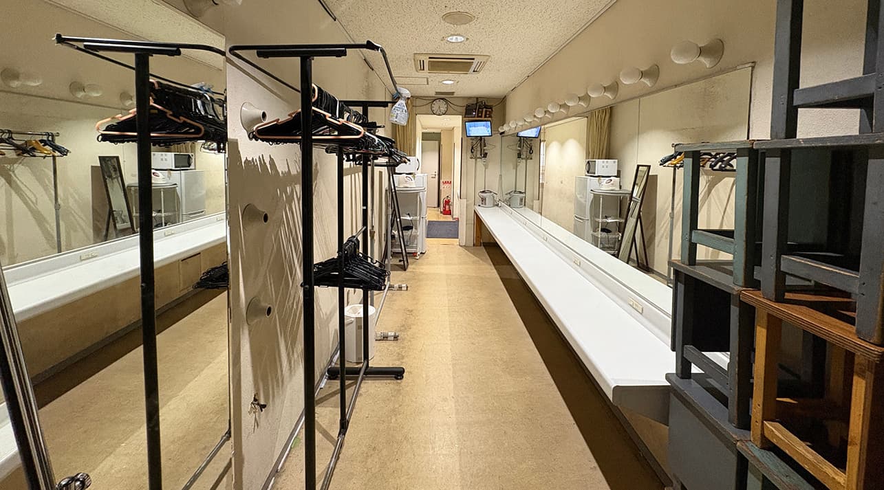 舞台客席の直ぐ横にあり、舞台にスムーズにアクセスする事の出来る縦長空間の楽屋です。楽屋専用のトイレと洗面、オプション使用できるシャワー室も完備しています。出演人数が多く、楽屋のスペースが不足する場合は、劇場事務所側のバックヤードに鏡前スペースを追加仮設することも可能です。